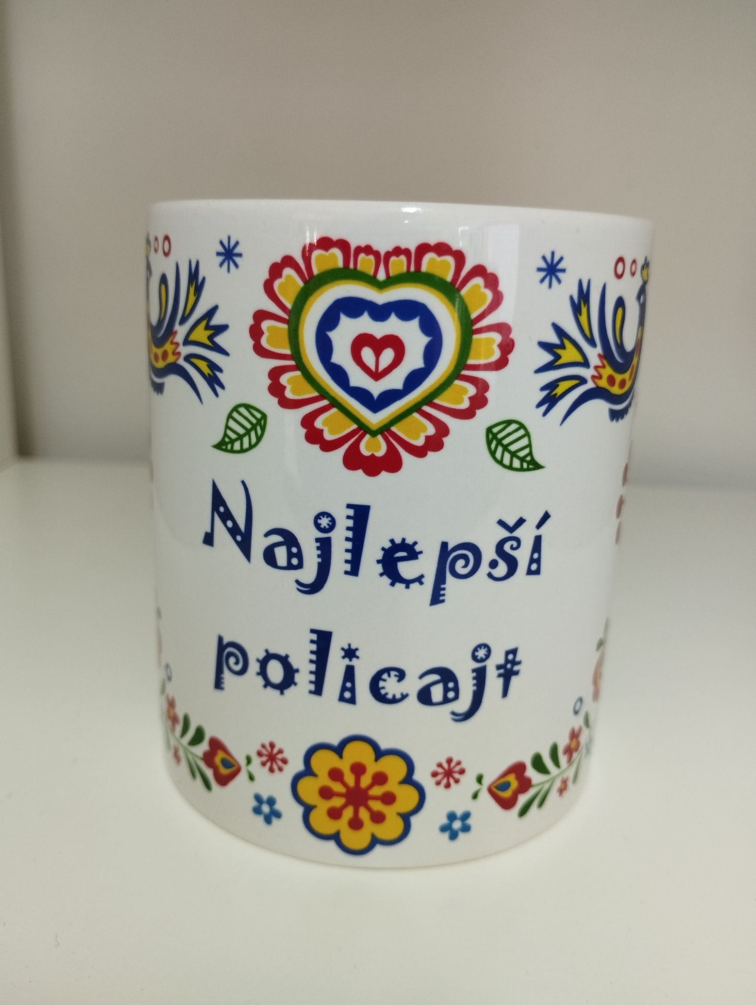 Keramický hrnček s folkórnym vzorom a venovaním.